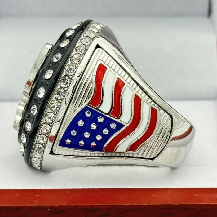 This ring is made of a zinc alloy. The ring body is silver in color. The stones on the side bezel are clear in color the stones in the top bezel are clear in color.  The left side of the ring shows 2nd and the right side shows an American flag. The top of the ring shows a trophy cup with clear stones.