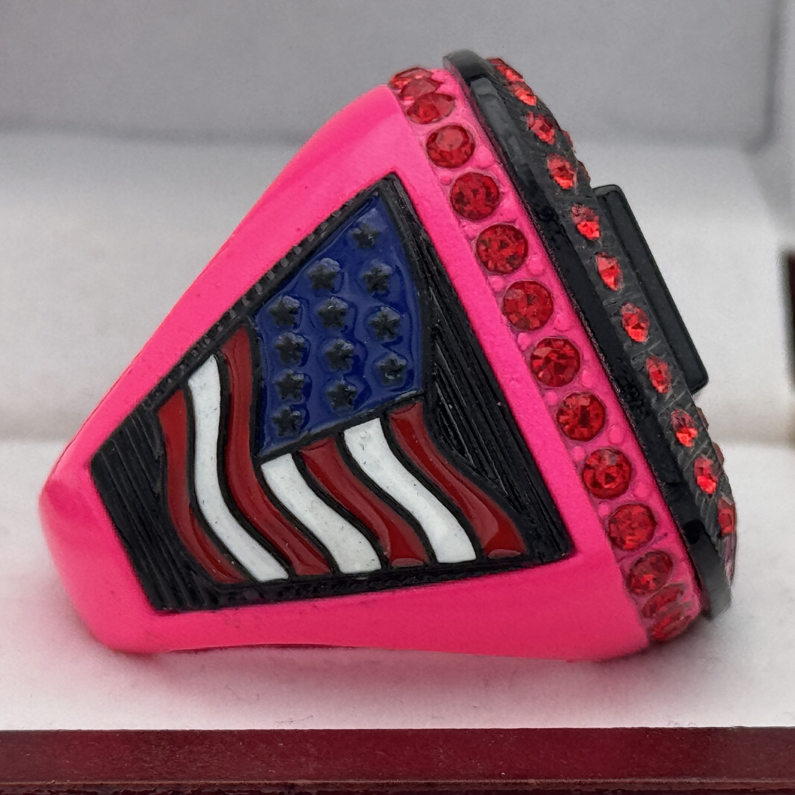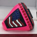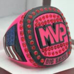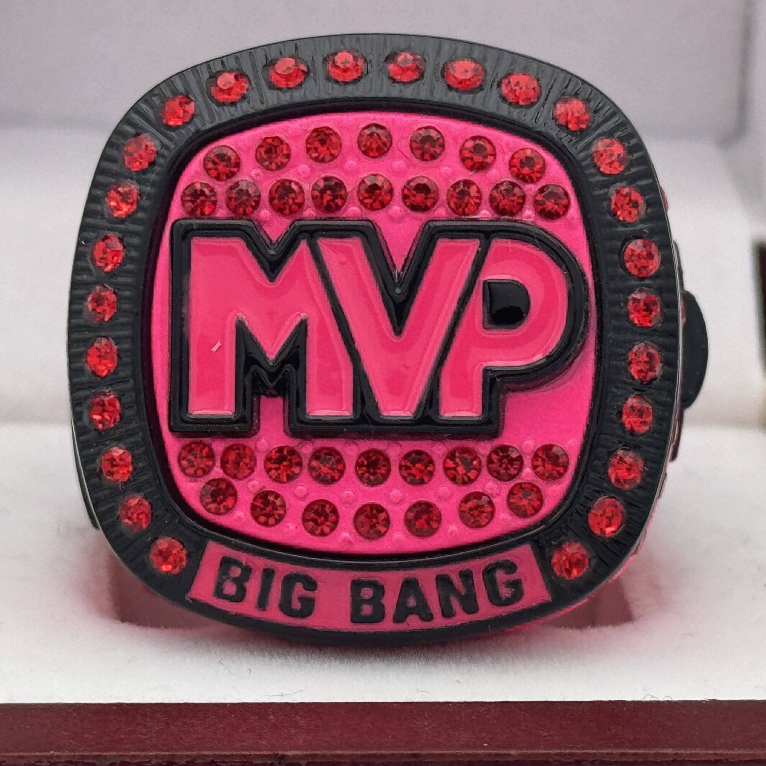 The ring body is neon pink  in color. The stones on the side bezel are pink in color the stones in the top bezel are pink in color. There is black color inserts on the sides of the rings. The left side of the ring shows an American Flag and the right side shows a trophy cup. The top of the ring shows MVP and Big Bang on the top.
