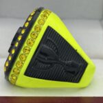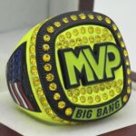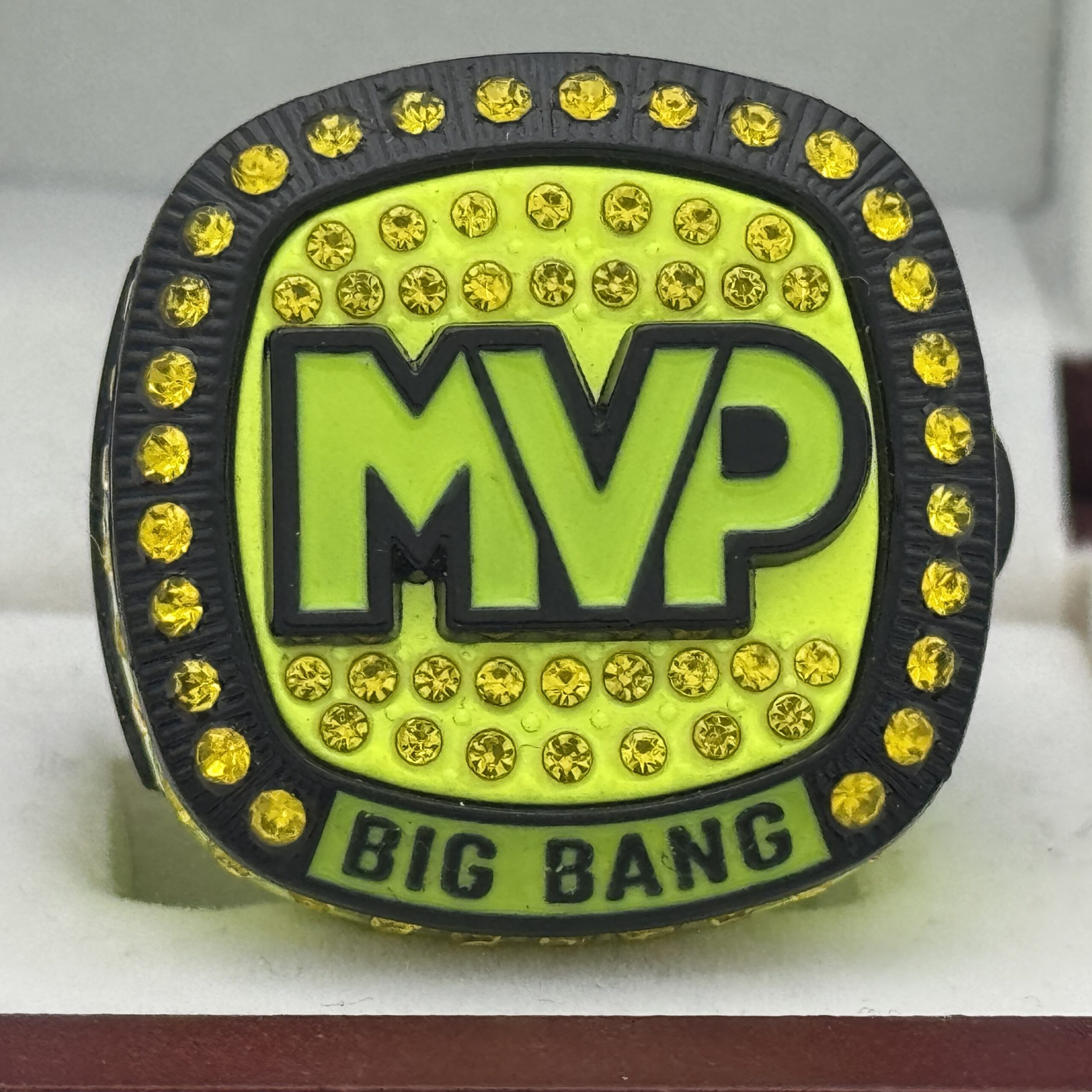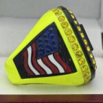 The ring body is neon yellow in color. The stones on the side bezel are yellow in color the stones in the top bezel are yellow in color. There is black color inserts on the sides of the rings. The left side of the ring shows an American Flag and the right side shows a trophy cup. The top of the ring shows MVP and Big Bang on the top.