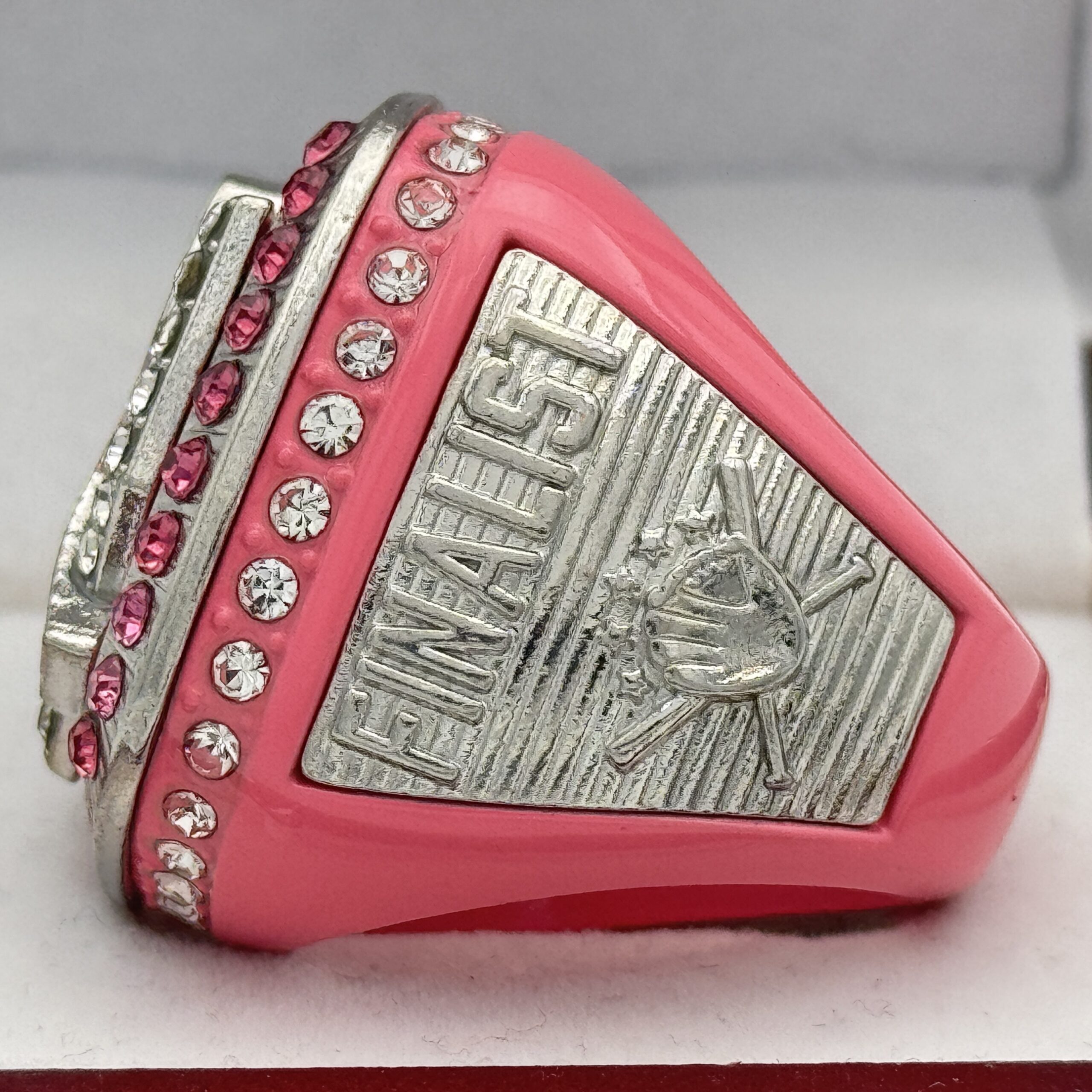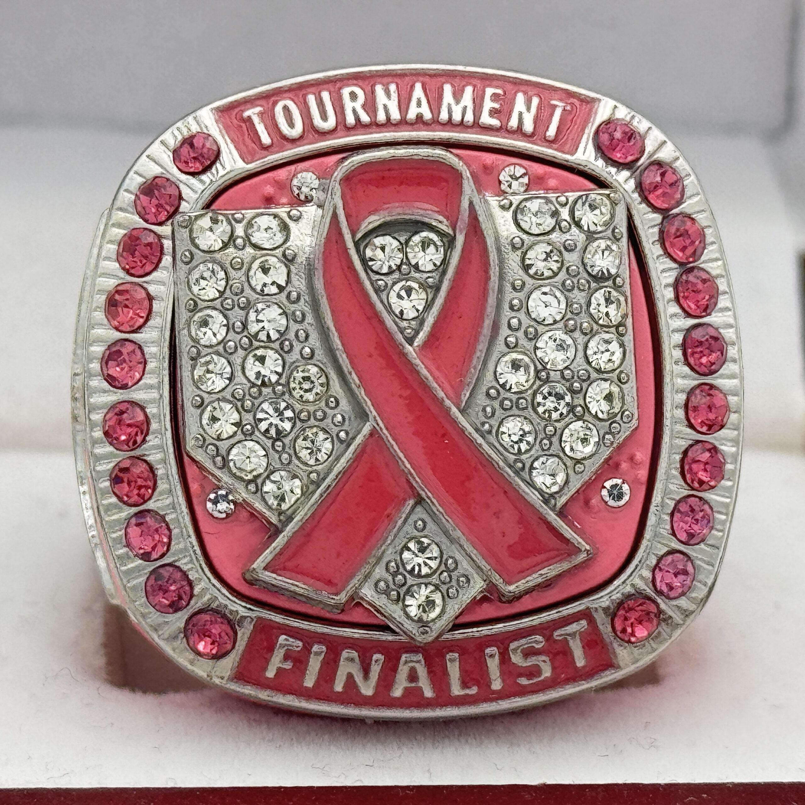 5 STAR DELUXE CANCER RIBBON HOME PLATE FINALIST RING — PINK BODY, CLEAR/PINK STONES, SILVER INSERTS, SOFTBALL/BASEBALL (Item #34-101)