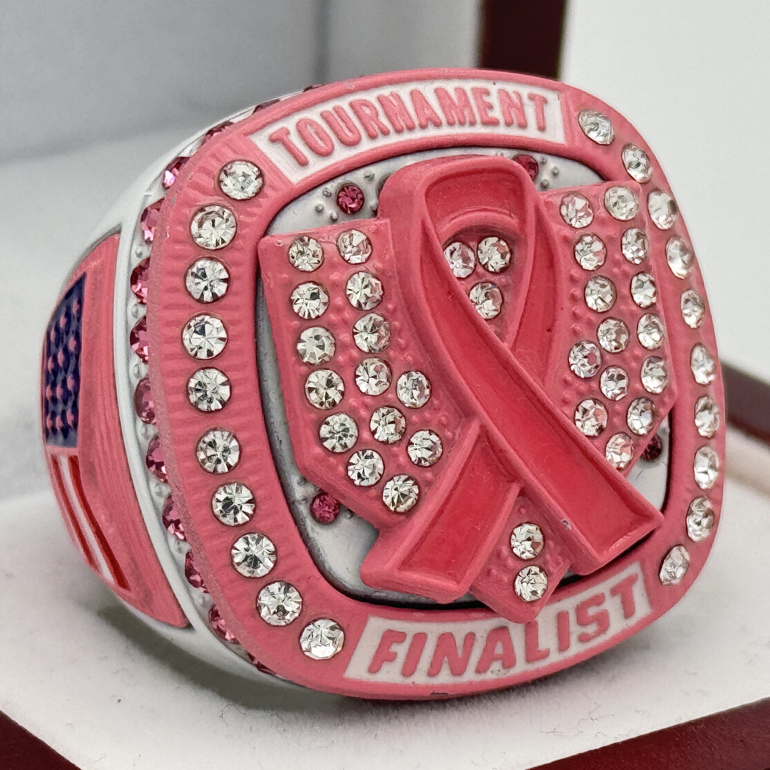 This ring is made of a zinc alloy. The ring body is white in color. The stones on the side bezel are pink in color the stones in the top bezel are clear in color. There are pink inserts on the tops and sides of the rings. The left side of the ring shows an American Flag and the right side shows a glove with crossed bats in the background and finalist. The top of the ring shows a home plate with a breast cancer awareness ribbon and tournament finalist on the top.