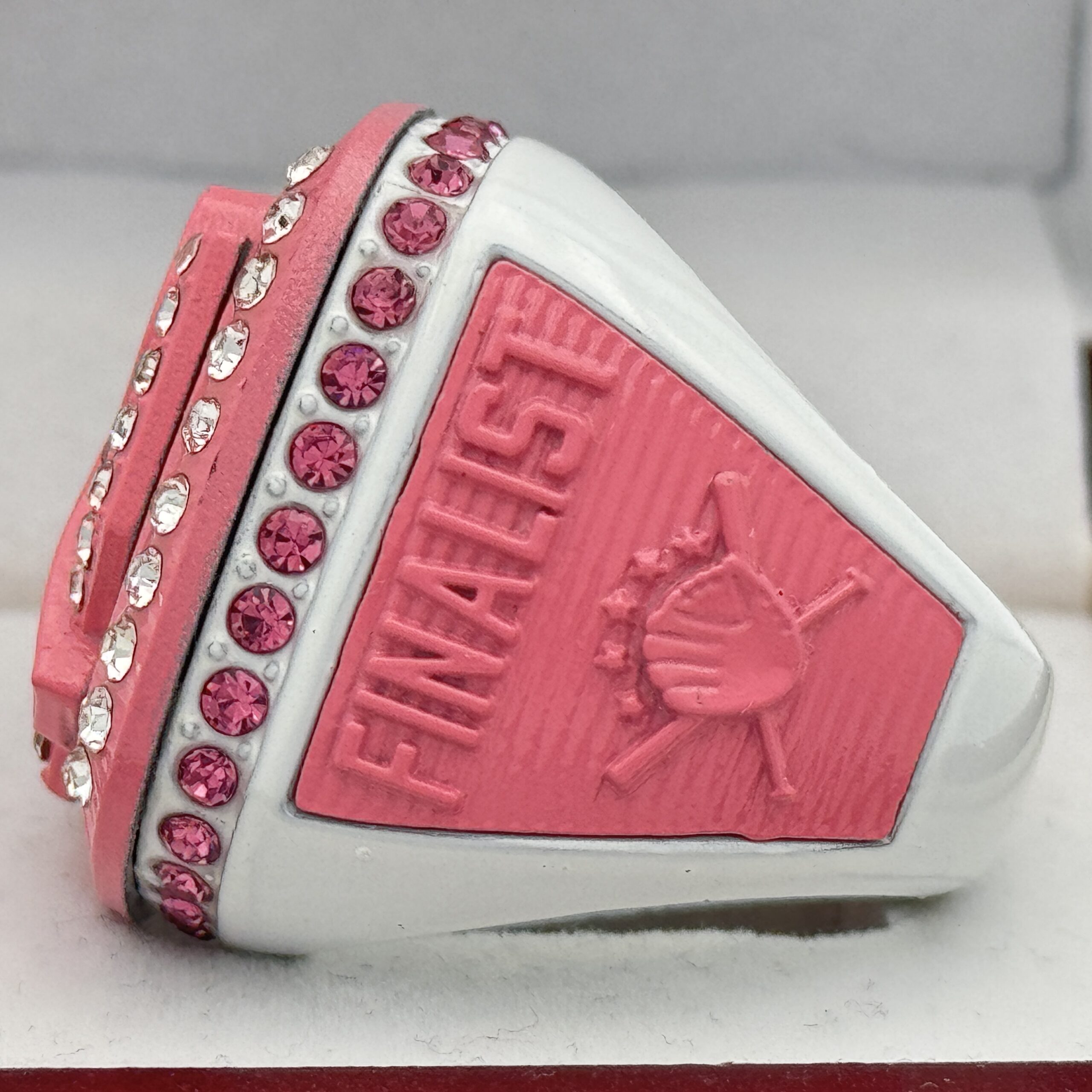 5 STAR DELUXE CANCER RIBBON HOME PLATE FINALIST RING — WHITE BODY, CLEAR/PINK STONES, PINK INSERTS, SOFTBALL/BASEBALL (Item #34-109)