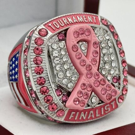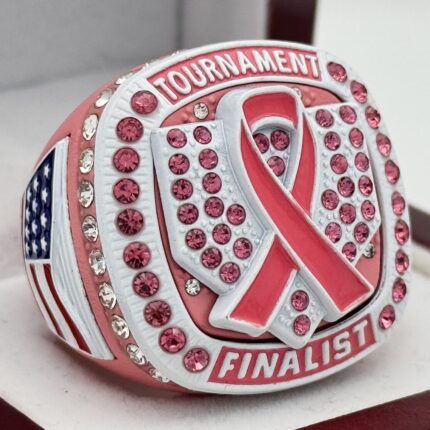 CANCER RING PINK RIBBON FINALIST — SILVER BODY, PINK STONES ON RIBBON, SOFTBALL/BASEBALL (Item #34-121)