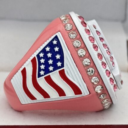5 STAR DELUXE CANCER RIBBON HOME PLATE FINALIST RING — PINK BODY, CLEAR/PINK STONES, WHITE INSERTS, SOFTBALL/BASEBALL (Item #34-105)