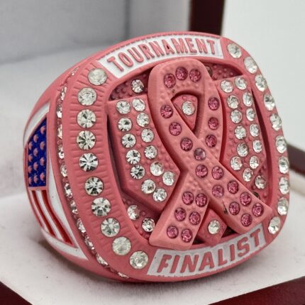 5 STAR DELUXE CANCER RIBBON HOME PLATE CHAMPION RING — PINK BODY, CLEAR/PINK STONES, WHITE INSERTS, SOFTBALL/BASEBALL (Item #34-108)