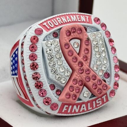 This ring is made of a zinc alloy. The ring body is blue in color. The stones on the side bezel are clear in color. The stones in the top bezels are blue in color. There are white inserts on the sides of the rings. The left side of the ring shows an American flag and the right side shows a star with an American flag. The top of the ring shows a solider kneeling and tournament finalist.Â