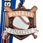 All of our medals are made of a zinc alloy. This medal is 2.75″ by 2.75″ with an 18″ ribbon. These medals are bronze in color and say baseball finalist with a painted ball and background. The ribbon is blue with red and white stripes with the word finalist and an image of a baseball.