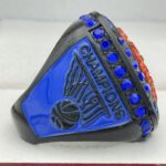 This ring is made of a zinc alloy. The ring body is black in color and the side bezel has blue colored stones. There is blue paint on the sides and top of the rings. The left side of the ring shows a basketball going through a net and champions the right side shows a trophy with a basketball on top. The top of the ring shows a basketball with orange stones and Basketball champions.
