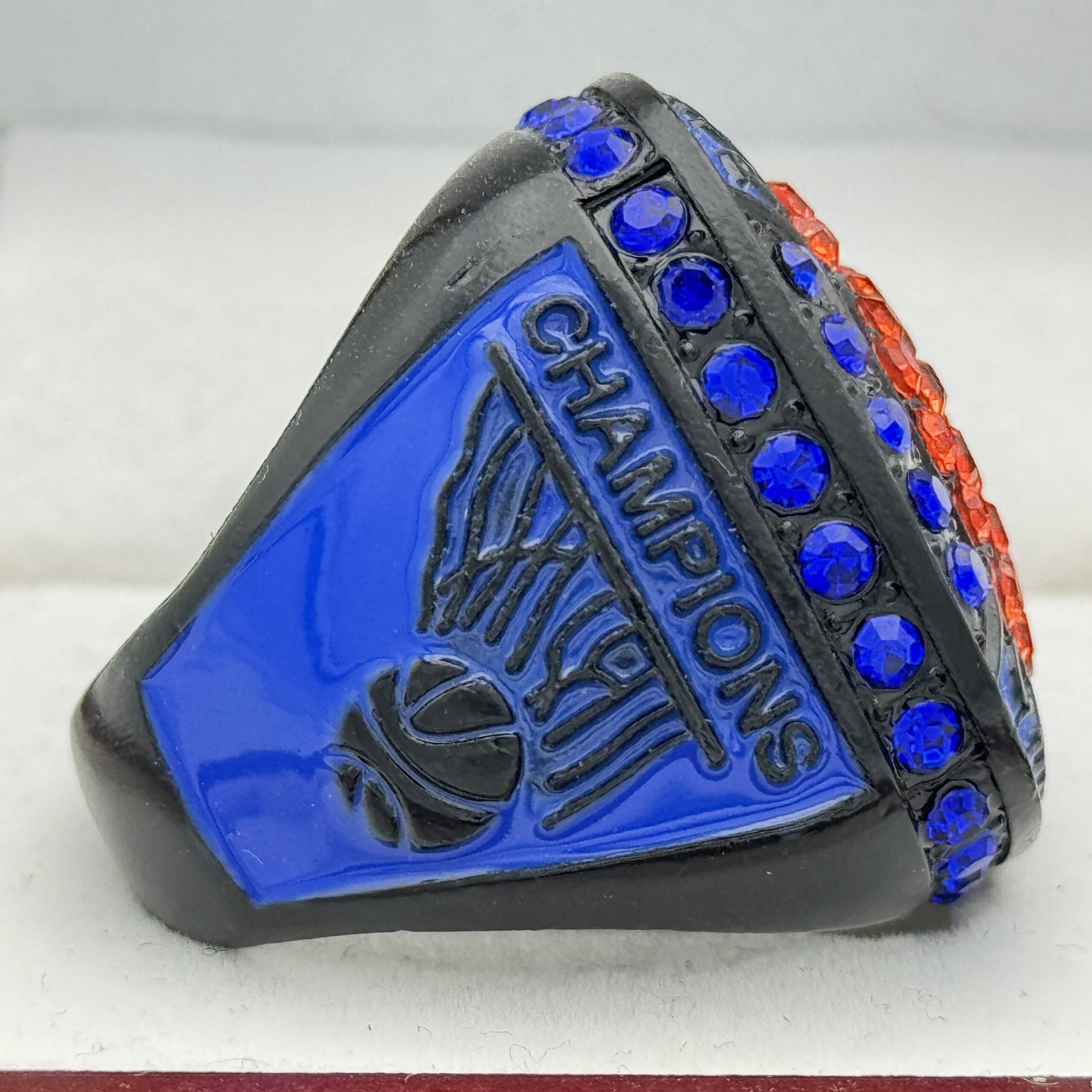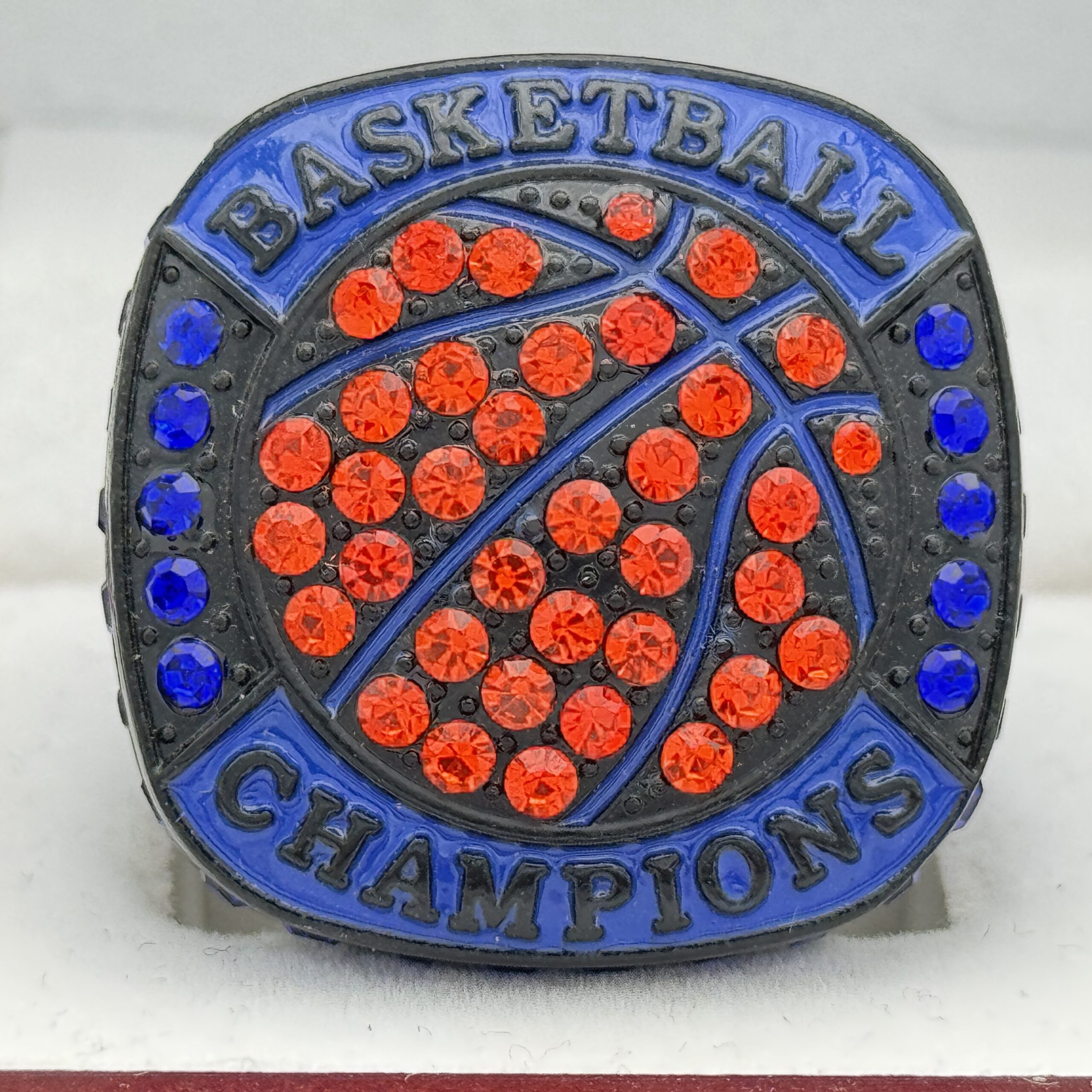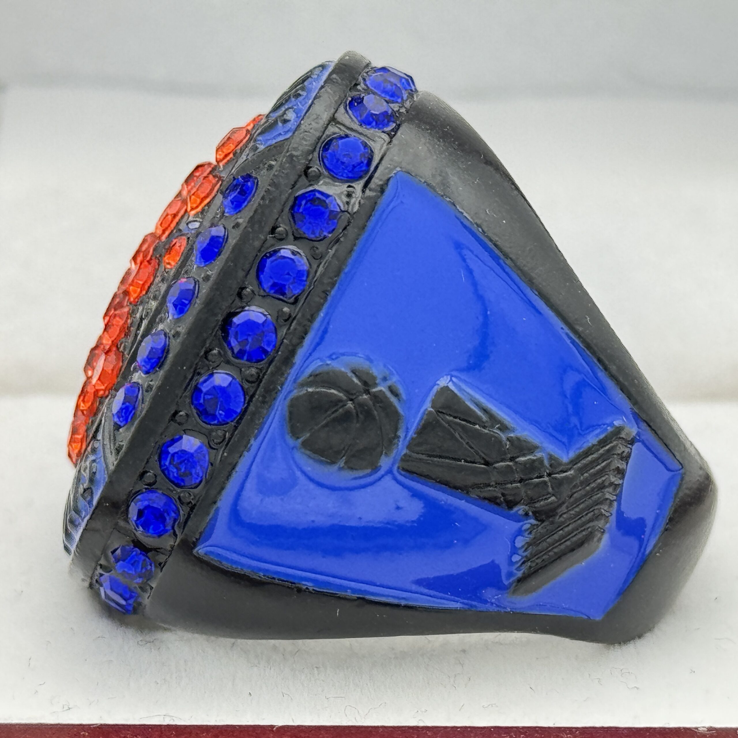 BASKETBALL CHAMPION RING — BLACK BODY, BLUE PAINT, ORANGE STONES ON BALL (Item #52-20)