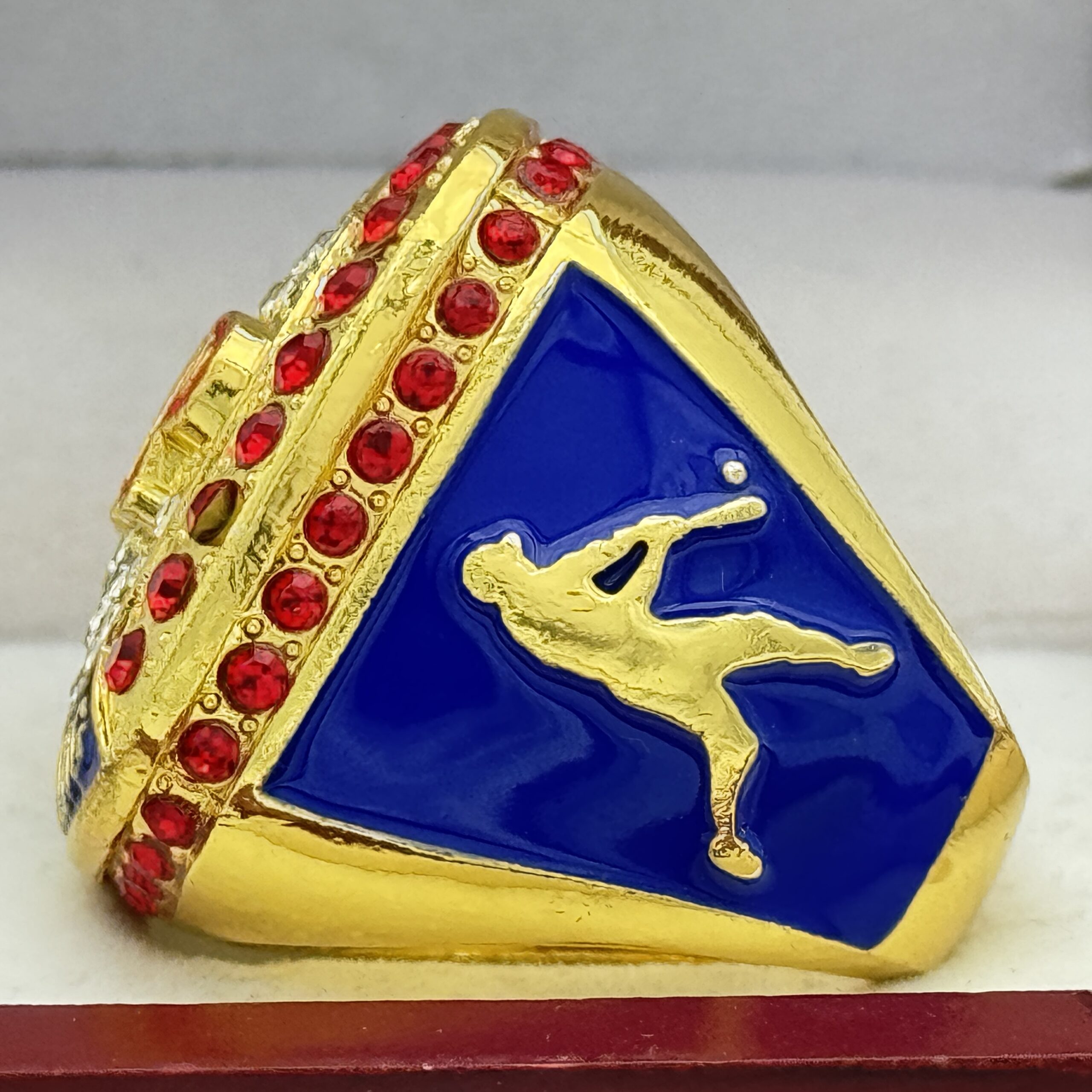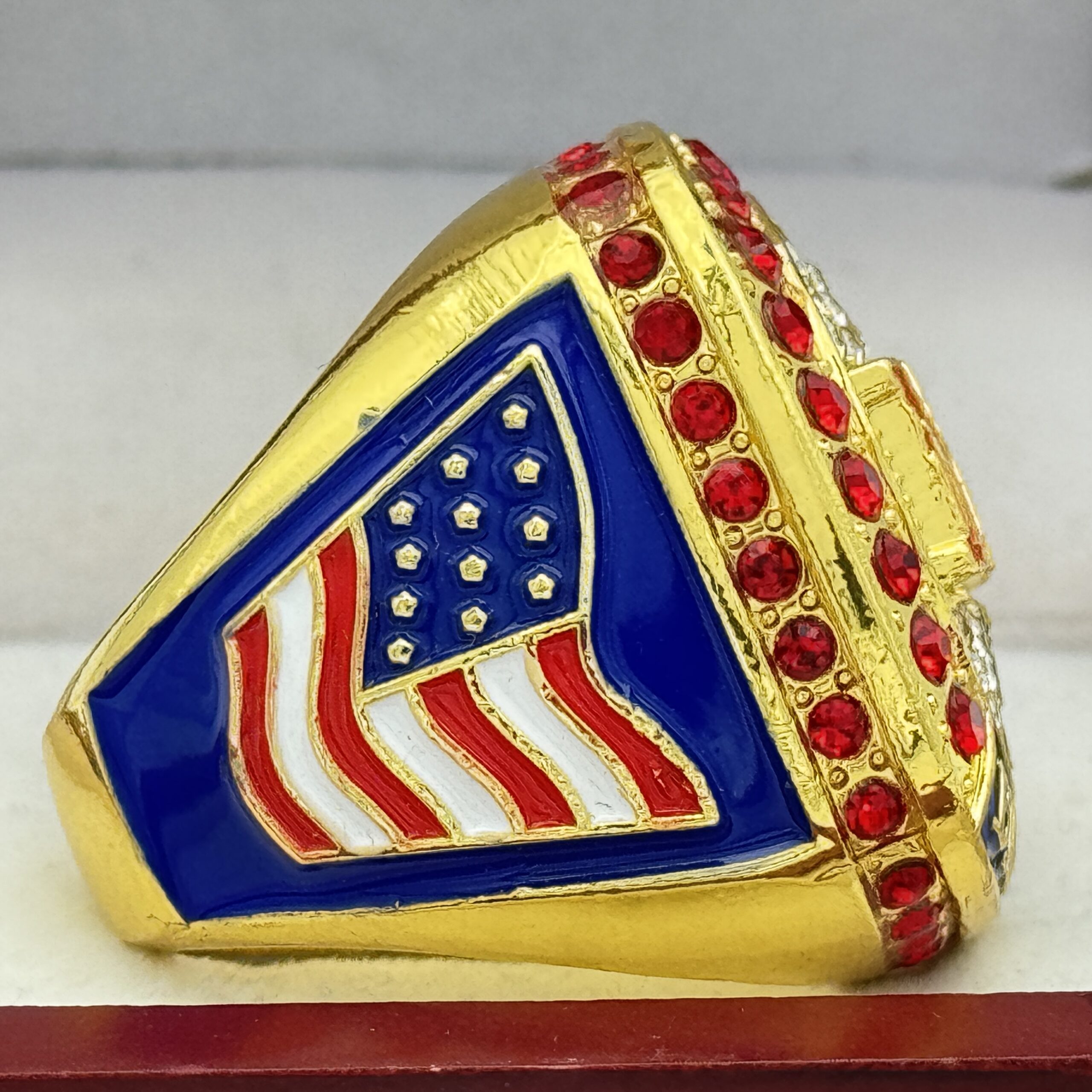 The ring body is gold in color. The stones on the side bezel are red in color the stones in the top bezel are red in color. There is blue colored paint on the sides of the rings. The left side of the ring shows an American flag and the right side shows a batter swinging. The top of the ring shows MVP and Big Bang.