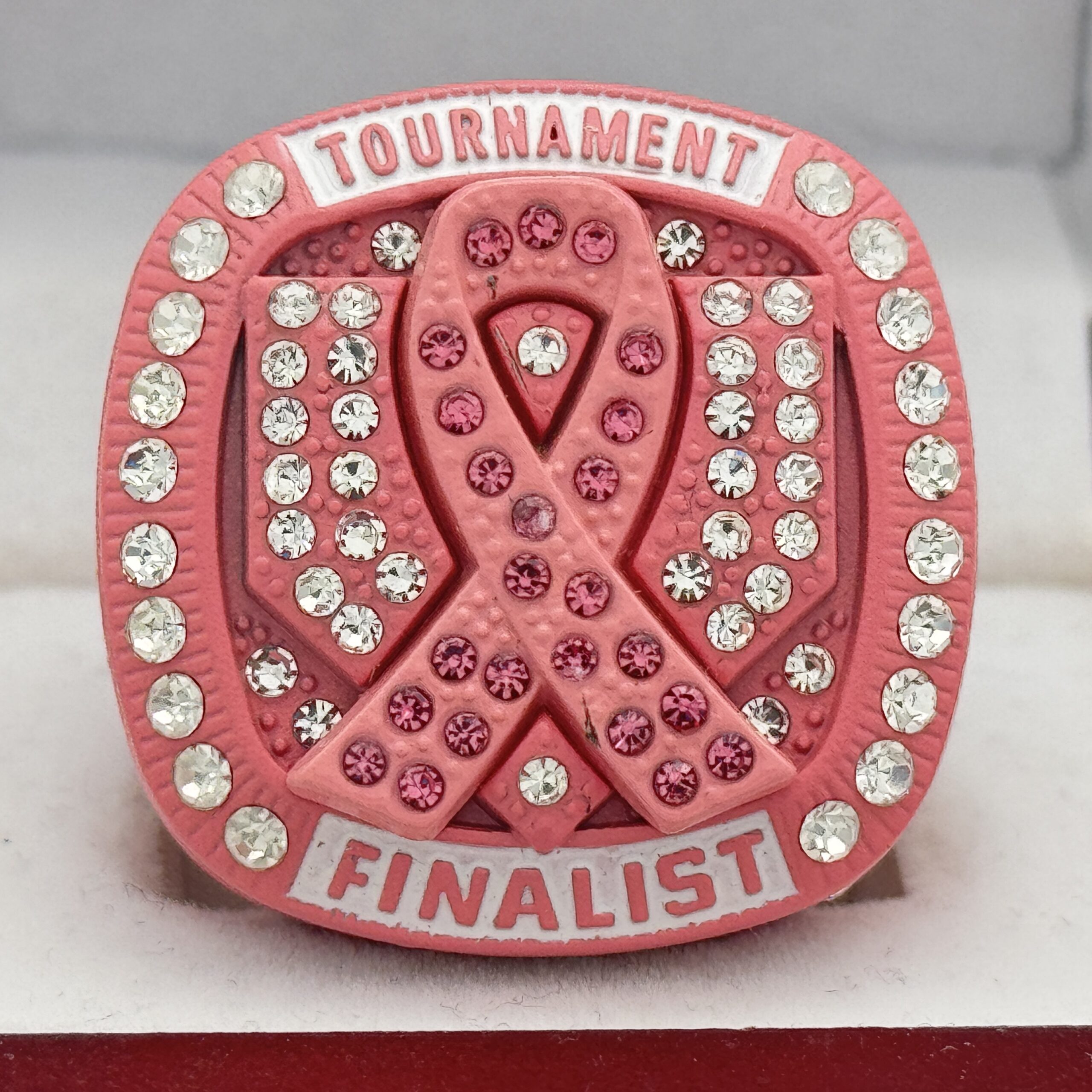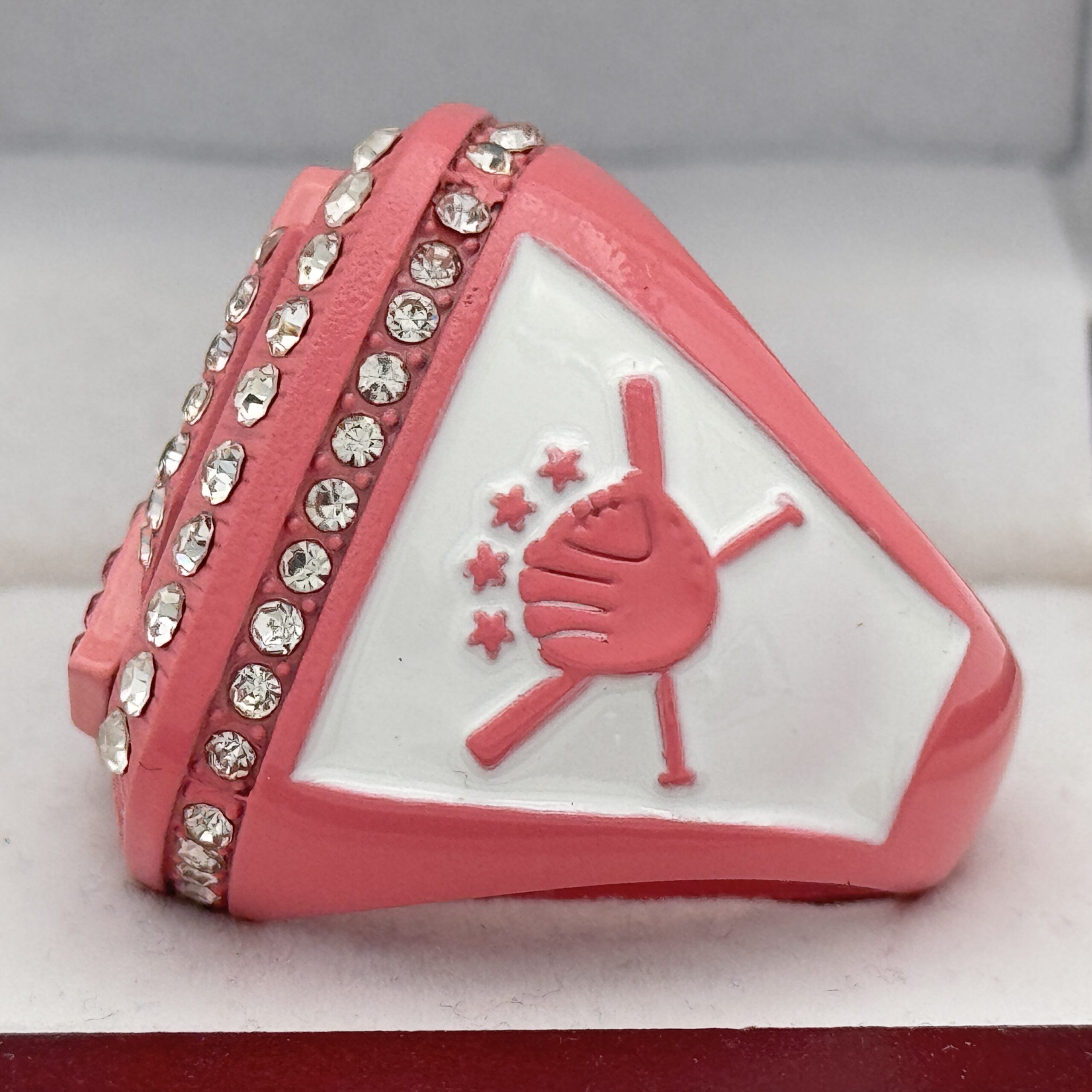 This ring is made of a zinc alloy. The ring body is pink in color. The stones on the side bezel are clear in color the stones in the top bezel are clear in color. There is white paint on the tops and sides of the rings. The left side of the ring shows an American Flag and the right side shows a glove with crossed bats in the background. The top of the ring shows a home plate with a breast cancer awareness ribbon and tournament finalist on the top.