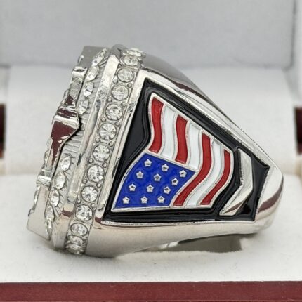 This ring is made of a zinc alloy. The ring body is pink in color. The stones on the side bezel are clear in color. The stones in the top bezels are clear in color. There is white paint on the sides of the rings. The left side of the ring shows an easter basket and the right side shows a glove and cross bats. The top of the ring shows an Easter bunny holding a baseball and tournament champions.Â