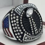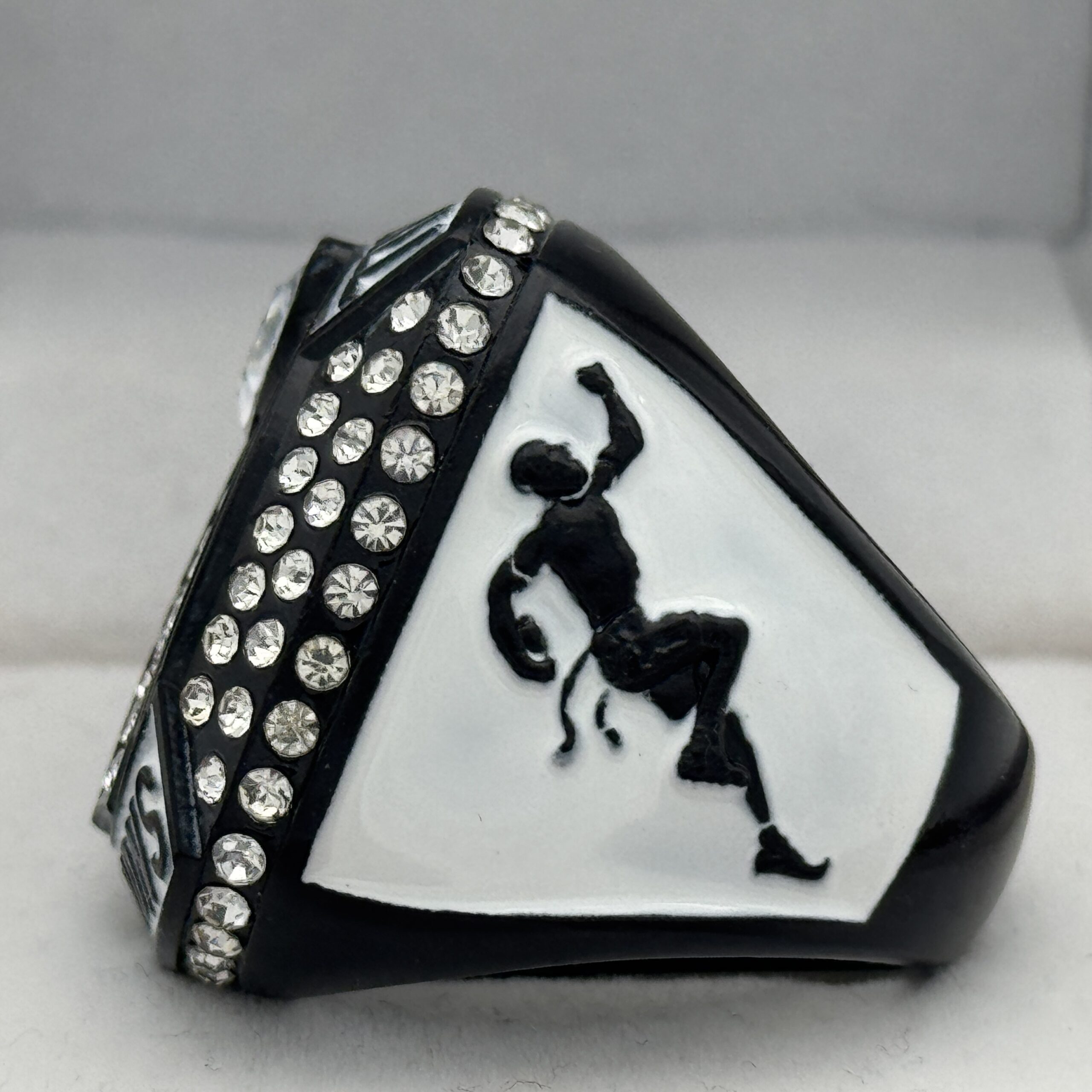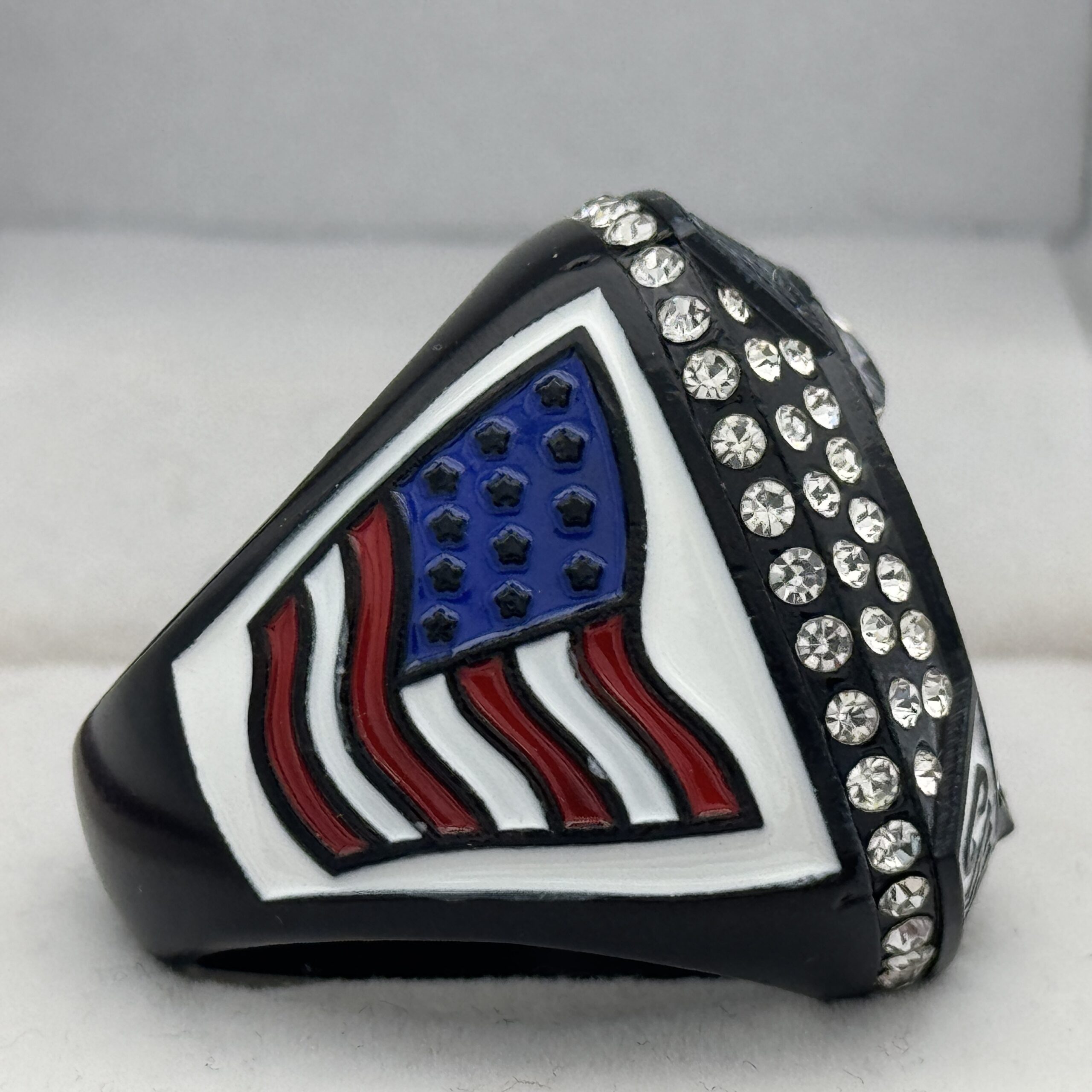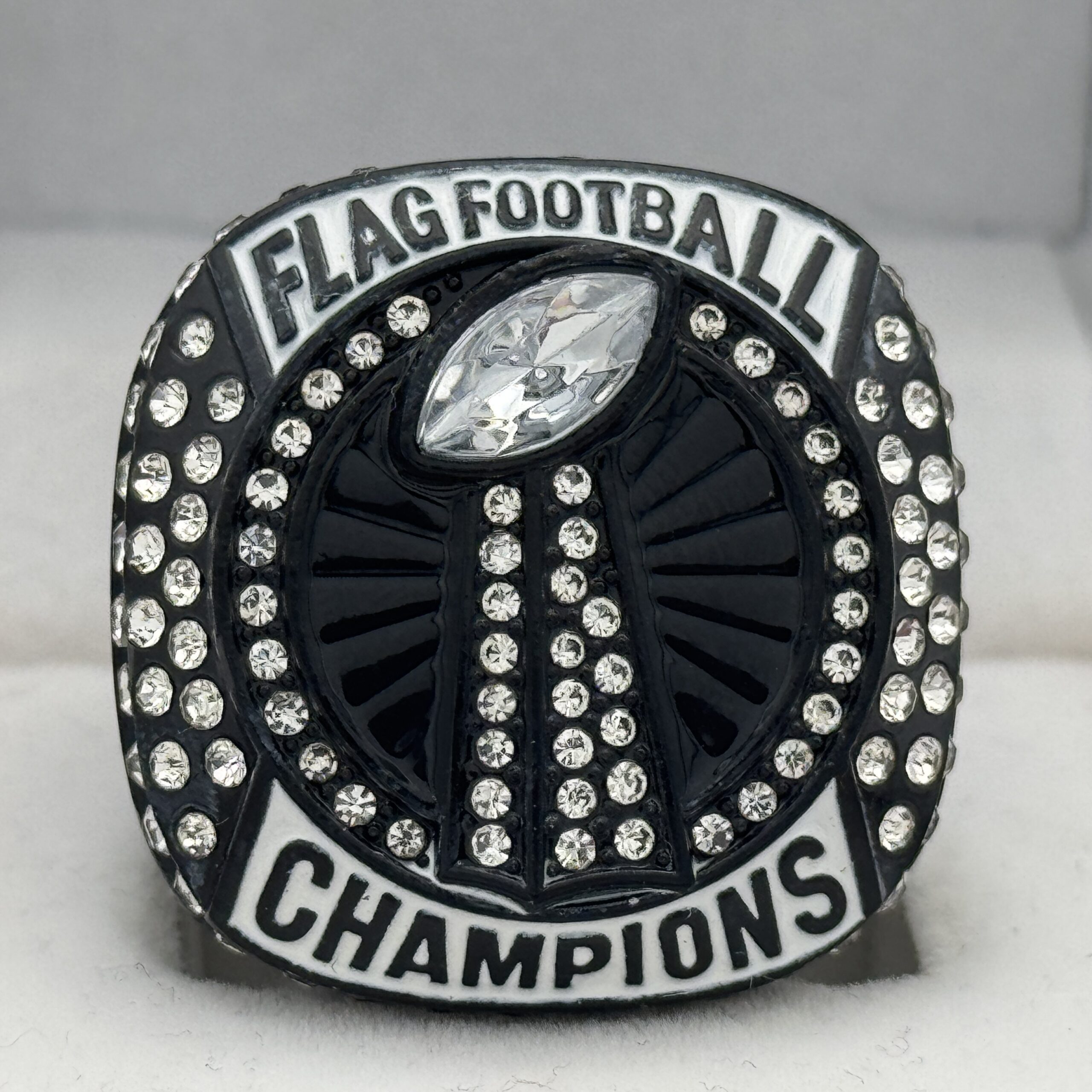 This ring is made of a zinc alloy. The ring is balck in color. The stones on the side bezel are clear in color. There is white paint on the sides of the rings and white paint on the top of the ring. The right side of the ring shows a player running with two flags on their belt and the left side shows the American flag. The top of the ring is a football and a trophy with clear stones and flag football champion.