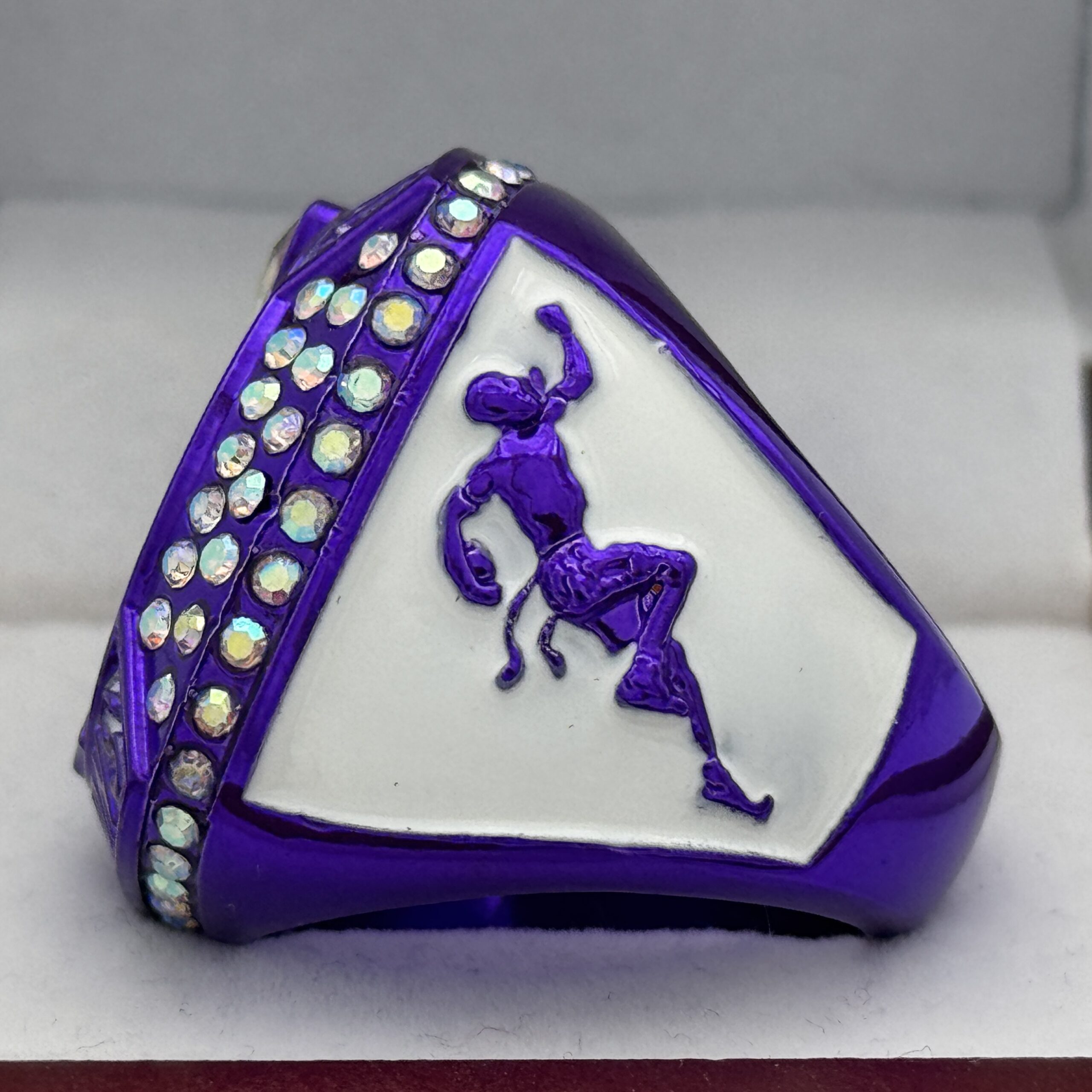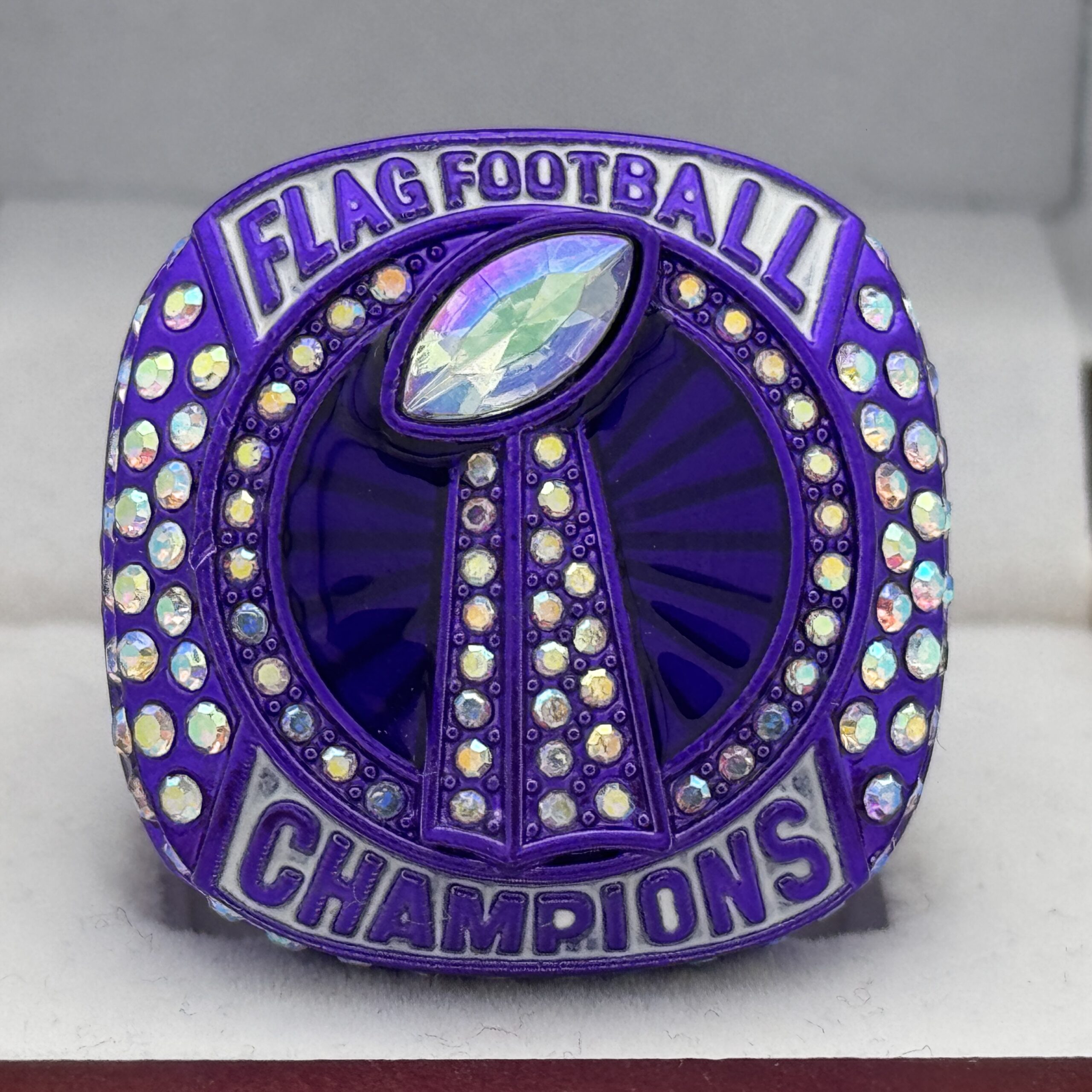 This ring is made of a zinc alloy. The ring is purple in color. The stones on the side bezel are prismatic in color. There is white paint on the sides of the rings and white paint on the top of the ring. The right side of the ring shows a player running with two flags on their belt and the left side shows the American flag. The top of the ring is a football and a trophy with prismatic stones and flag football champion.