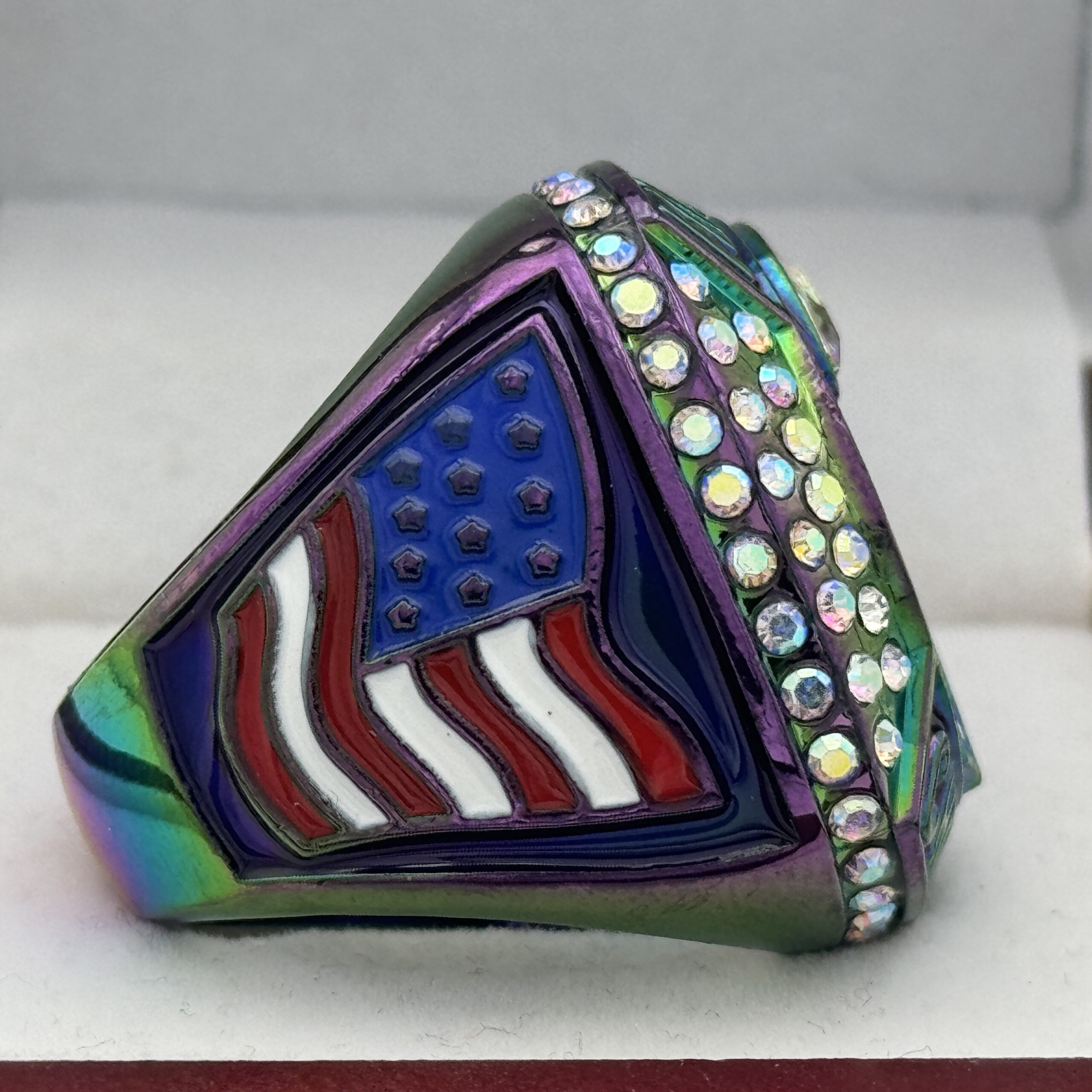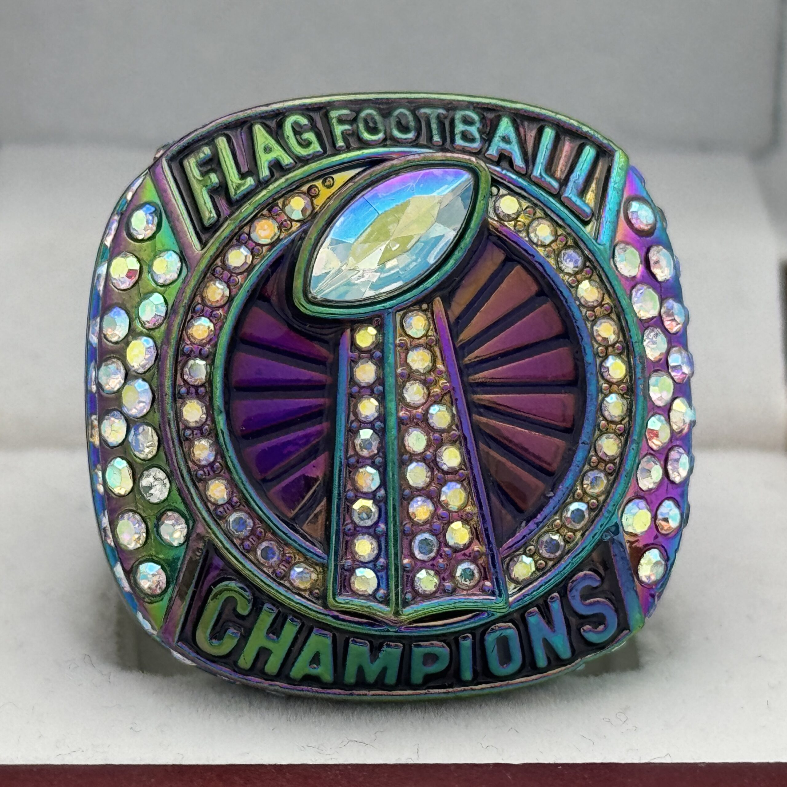 This ring is made of a zinc alloy. The ring is rainbow in color. The stones on the side bezel are prismatic in color. There is purple paint on the sides of the rings and purple paint on the top of the ring. The right side of the ring shows a player running with two flags on their belt and the left side shows the American flag. The top of the ring is a football and a trophy with prismatic stones and flag football champion.