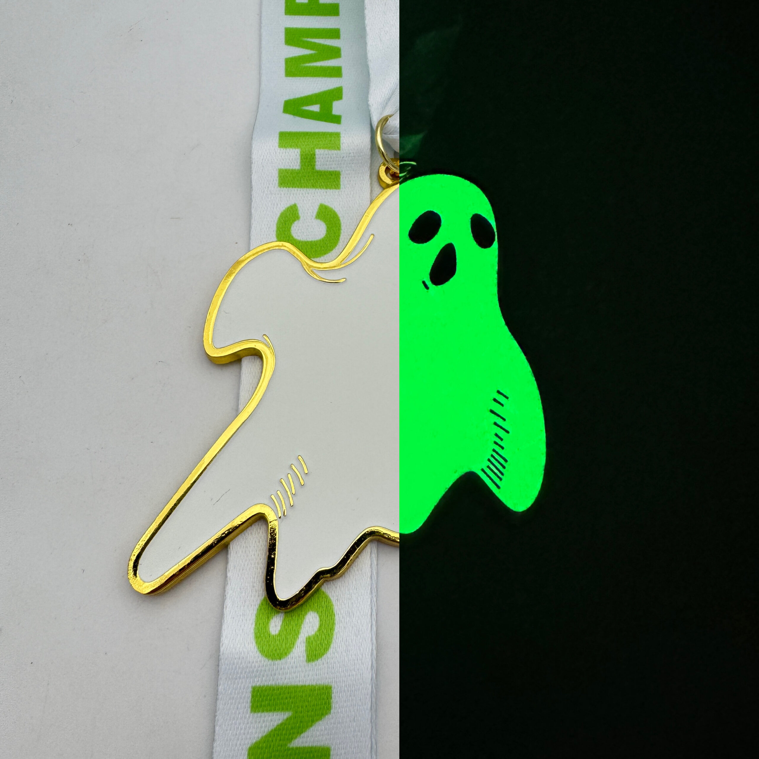 All of our medals are made of a zinc alloy. These medals are gold in color with a glow in the dark ghost. The ribbon is white and green with the word champions and a ghost. To activate the medal, hold it in sunlight or under a flashing to charge the glow in the dark material. Then, turn out the lights and watch the haunting glow light up.Â