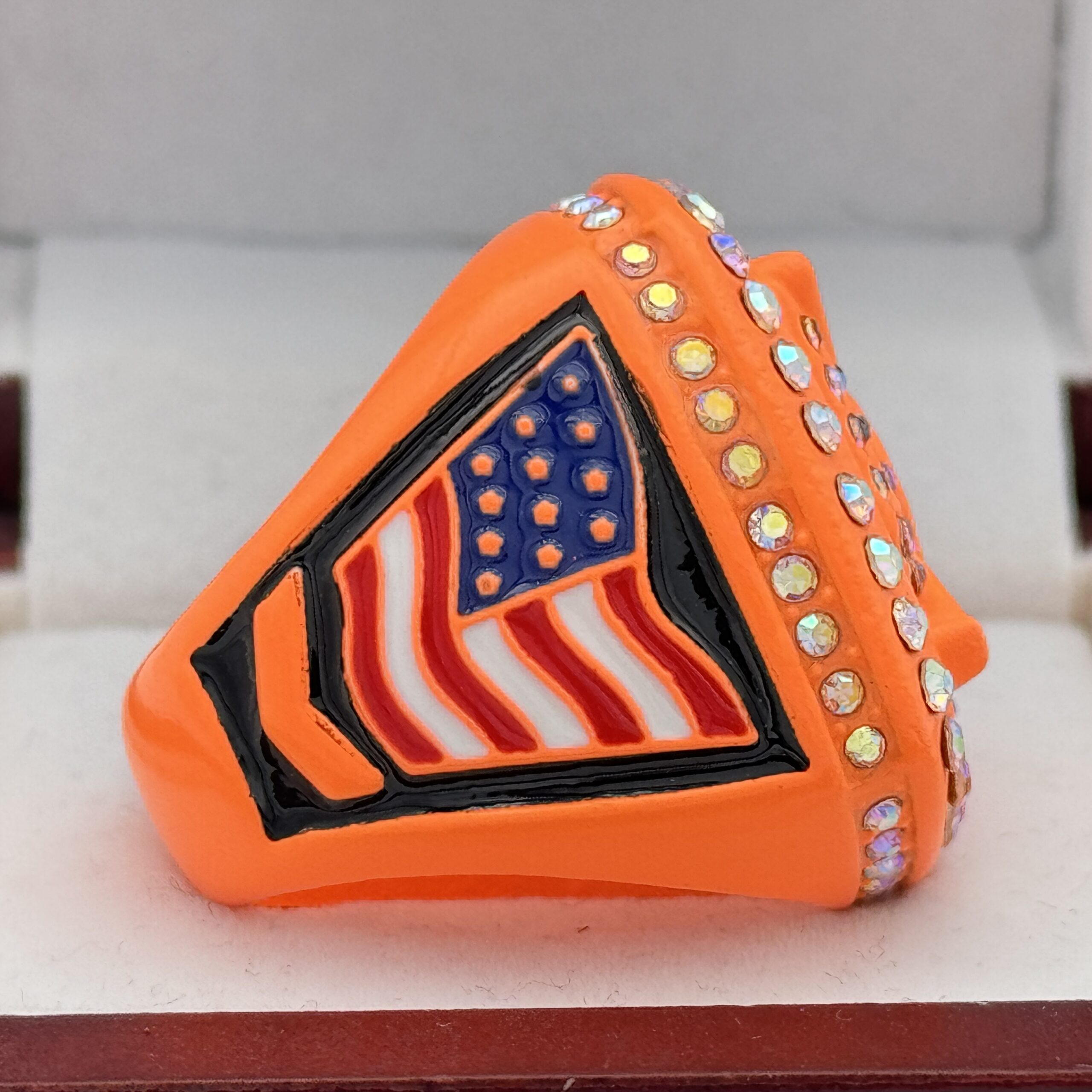 This ring is made of a zinc alloy. The ring body is neon orange in color. The stones on the side bezel are prismatic in color the stones in the top bezel are prismatic in color. There is black color paint on the sides of the rings. The left side of the ring shows an American Flag and the right side shows a glove with crossed bats in the background. The top of the ring shows a home plate with crossed bats in the background with prismatic stones.