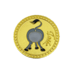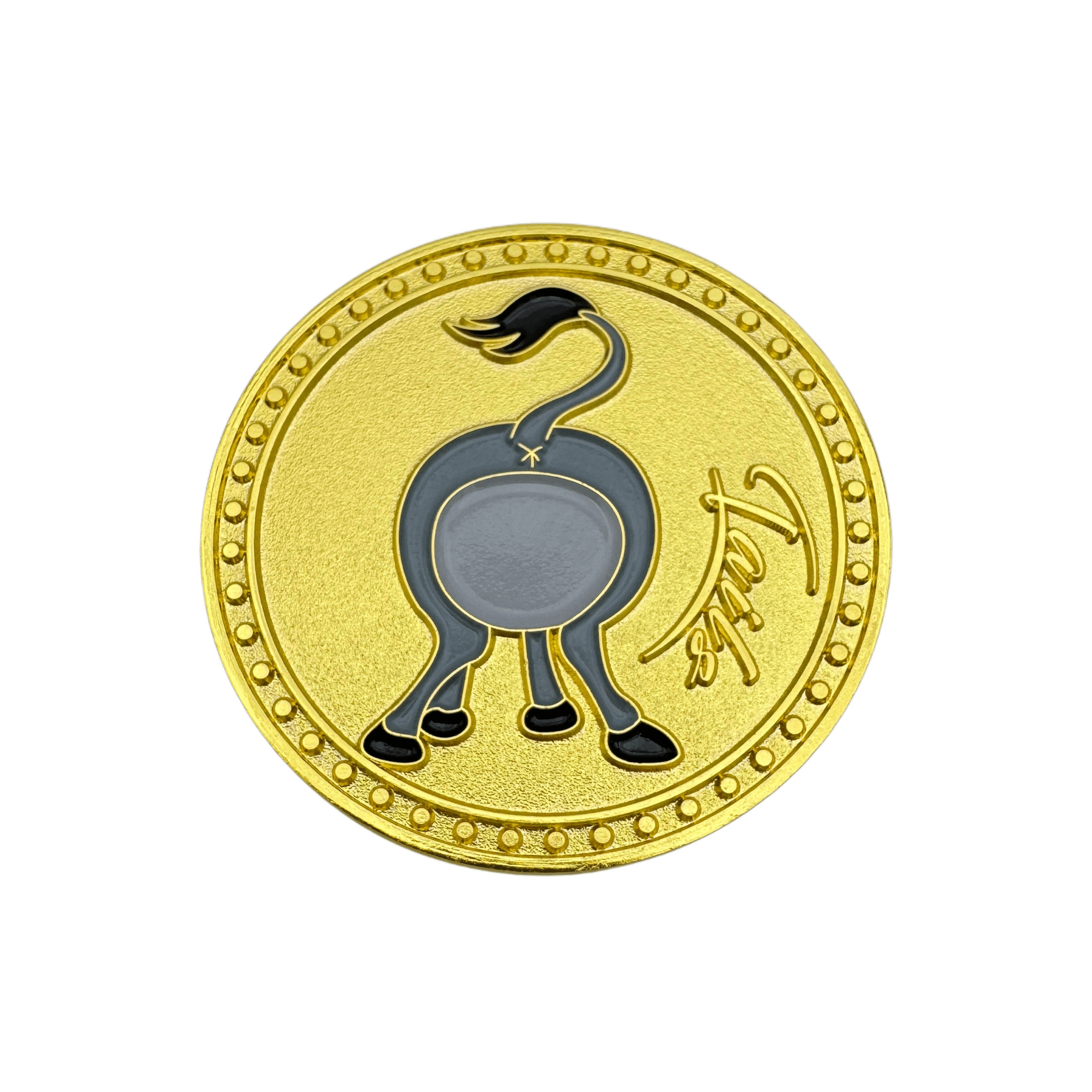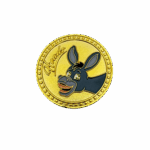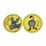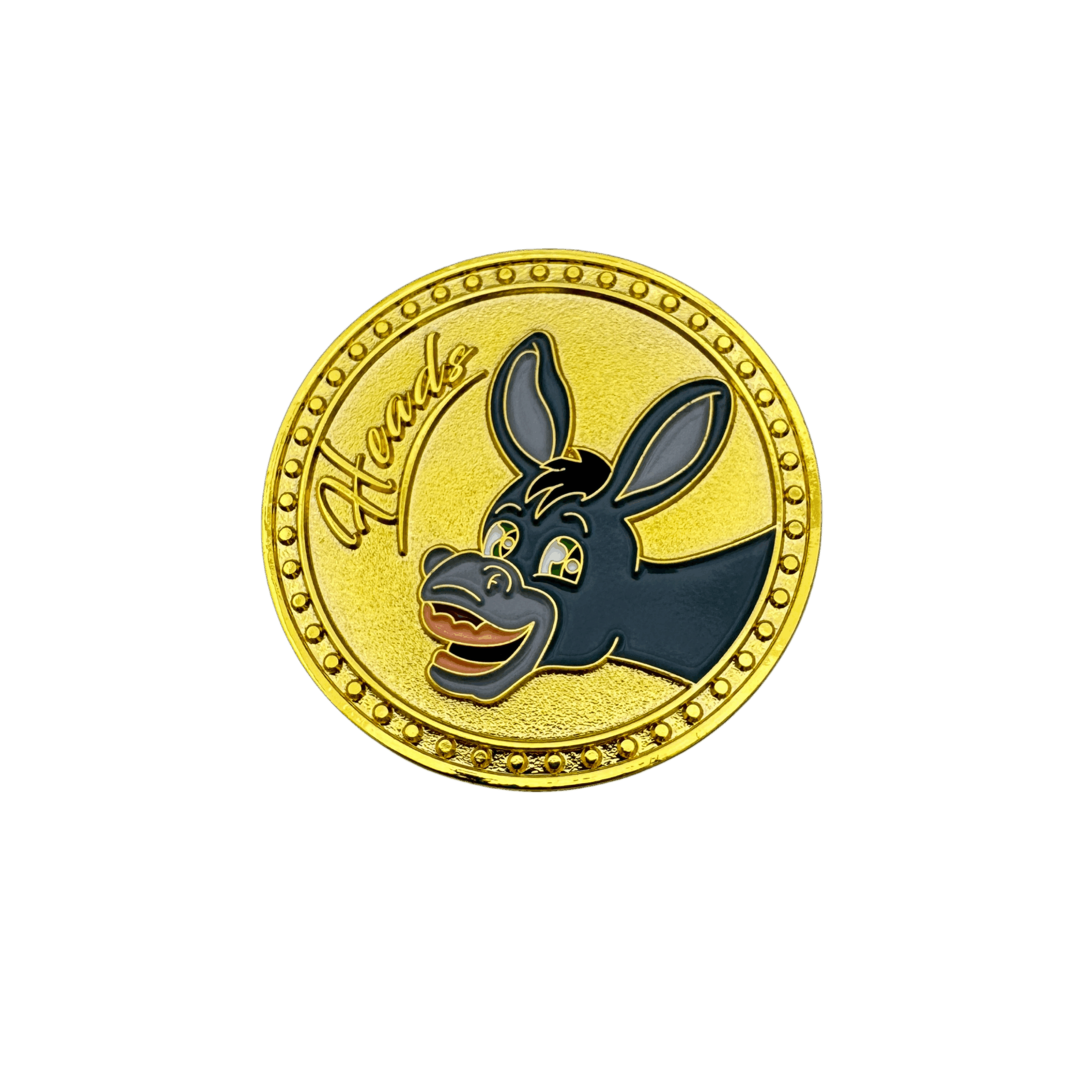 This coin is made of a zinc alloy. The coin is gold in color. The heads side of the coin shows a donkey’s face and the tails side of the coin shows a donkeys butt.