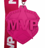 All of our medals are made of a zinc alloy. The medal is 2.75″ by 3″ with an 18″ ribbon. These medals are neon pink in color and shows MVP on top of a star. The ribbon is pink with MVP and a star.