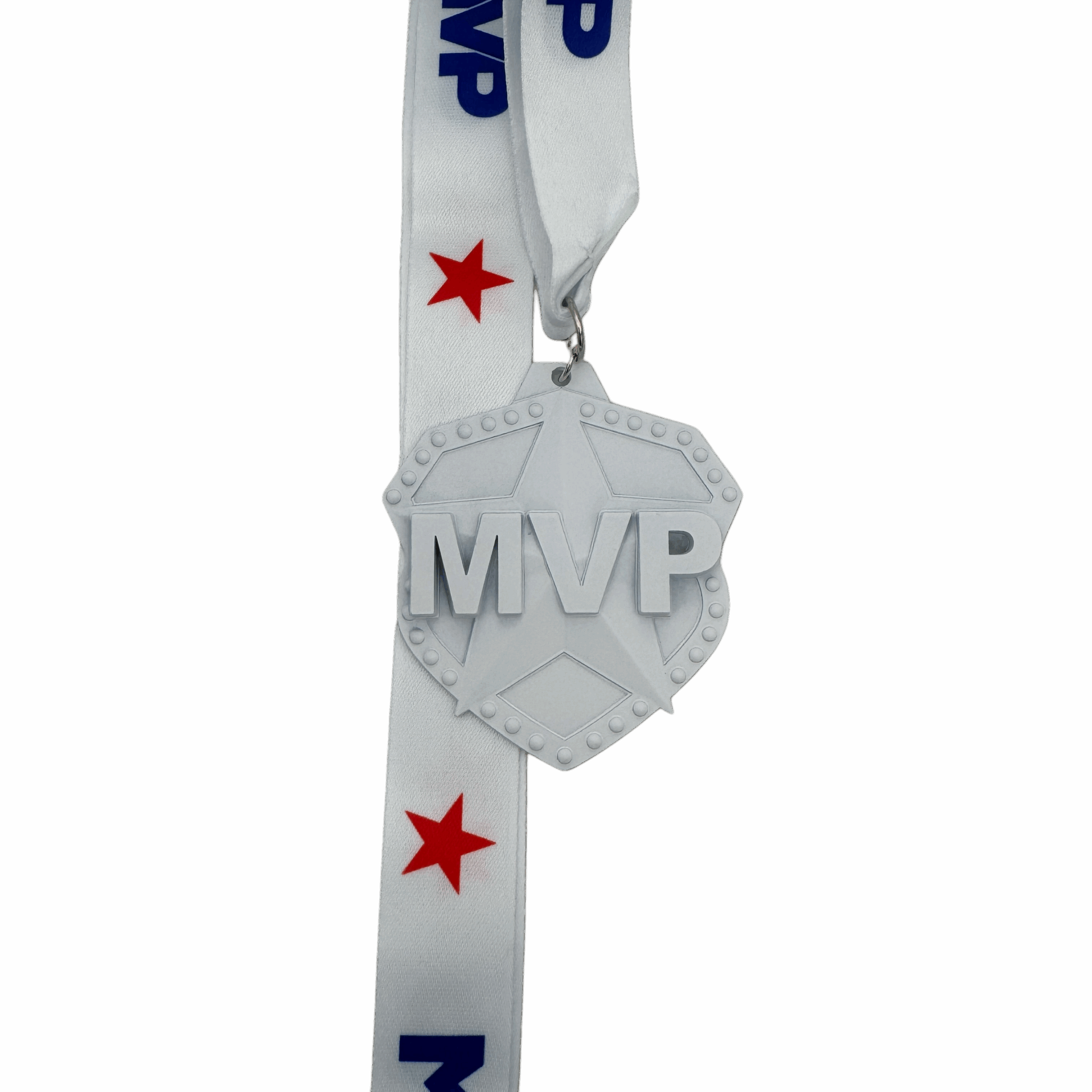 All of our medals are made of a zinc alloy. The medal is 2.75″ by 3″ with an 18″ ribbon. These medals are white in color and shows MVP on top of a star. The ribbon is white with MVP and a star.Â