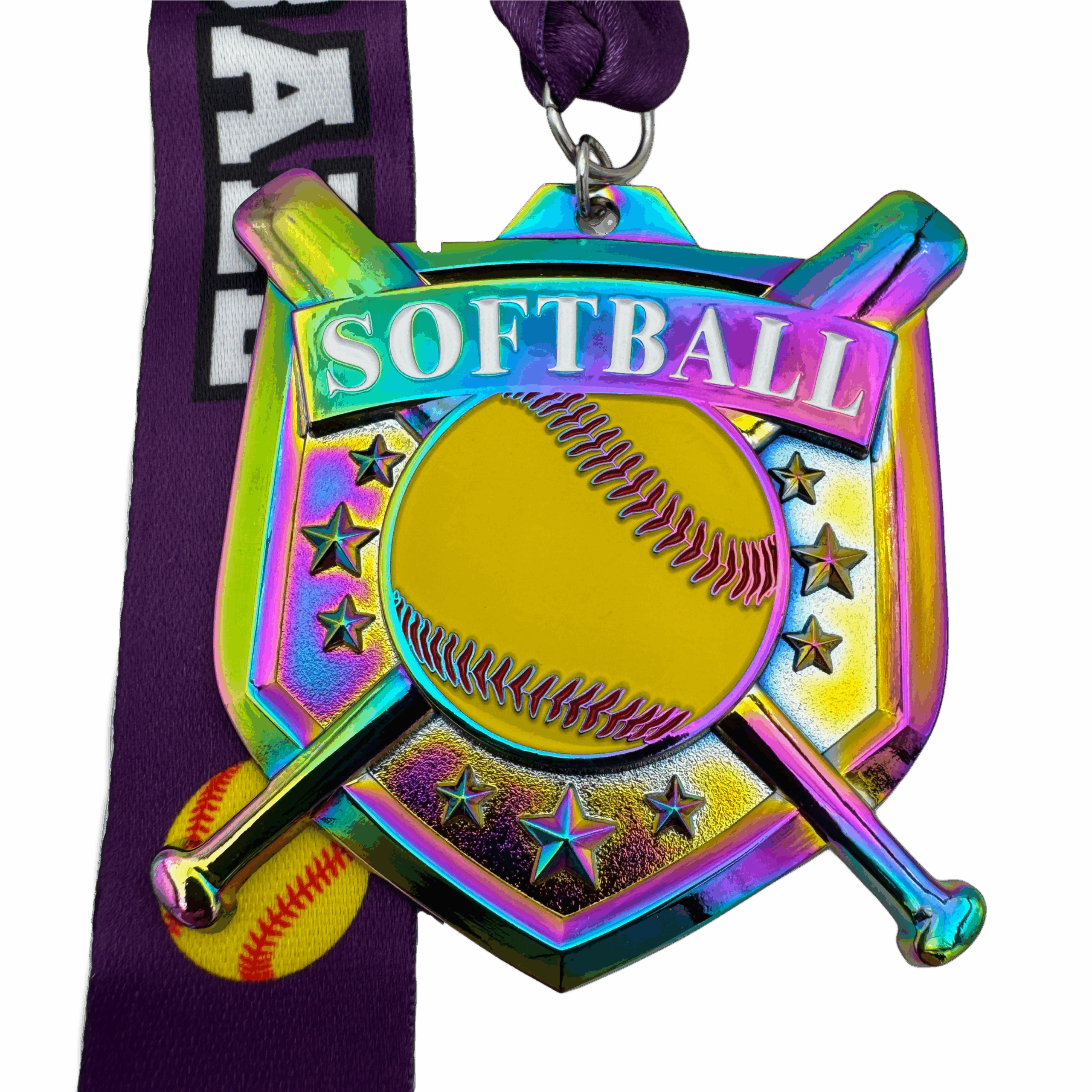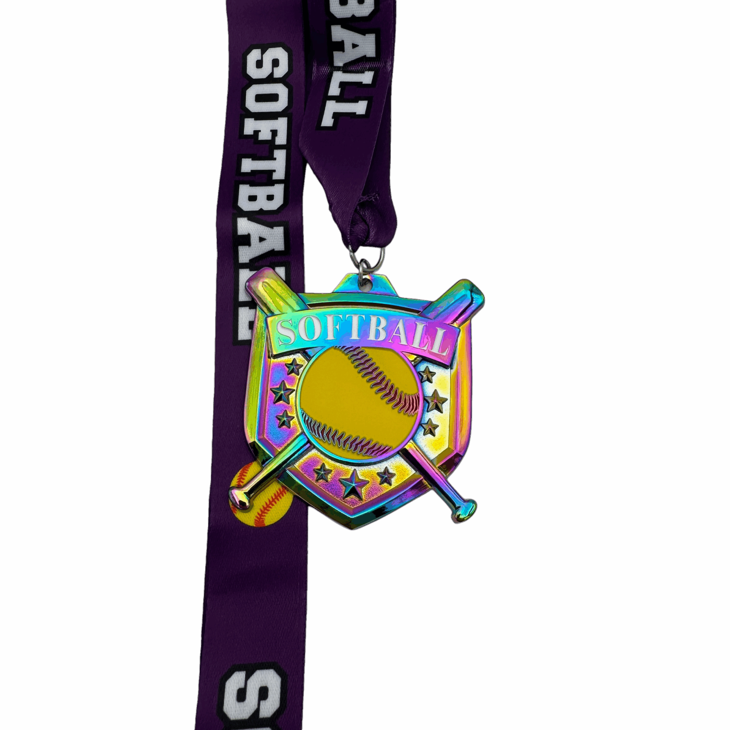 All of our medals are made of a zinc alloy. This medal is 2.75″ by 2.75″ with an 18″ ribbon. These medals are rainbow in color and say softball with a painted ball and background. The ribbon is purple with the word softball and an image of a softball.